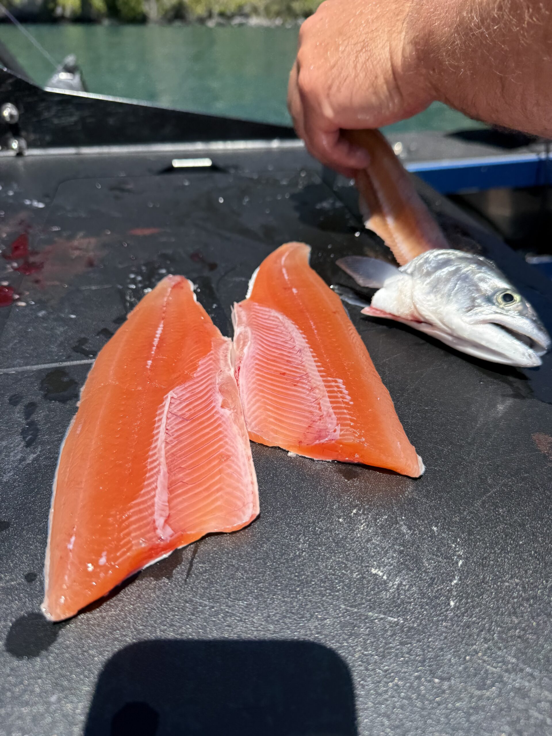 After landing a beautiful Chinook salmon, the guide quickly prepared the fish for us. Within minutes, we had clean slices of fresh salmon sashimi.